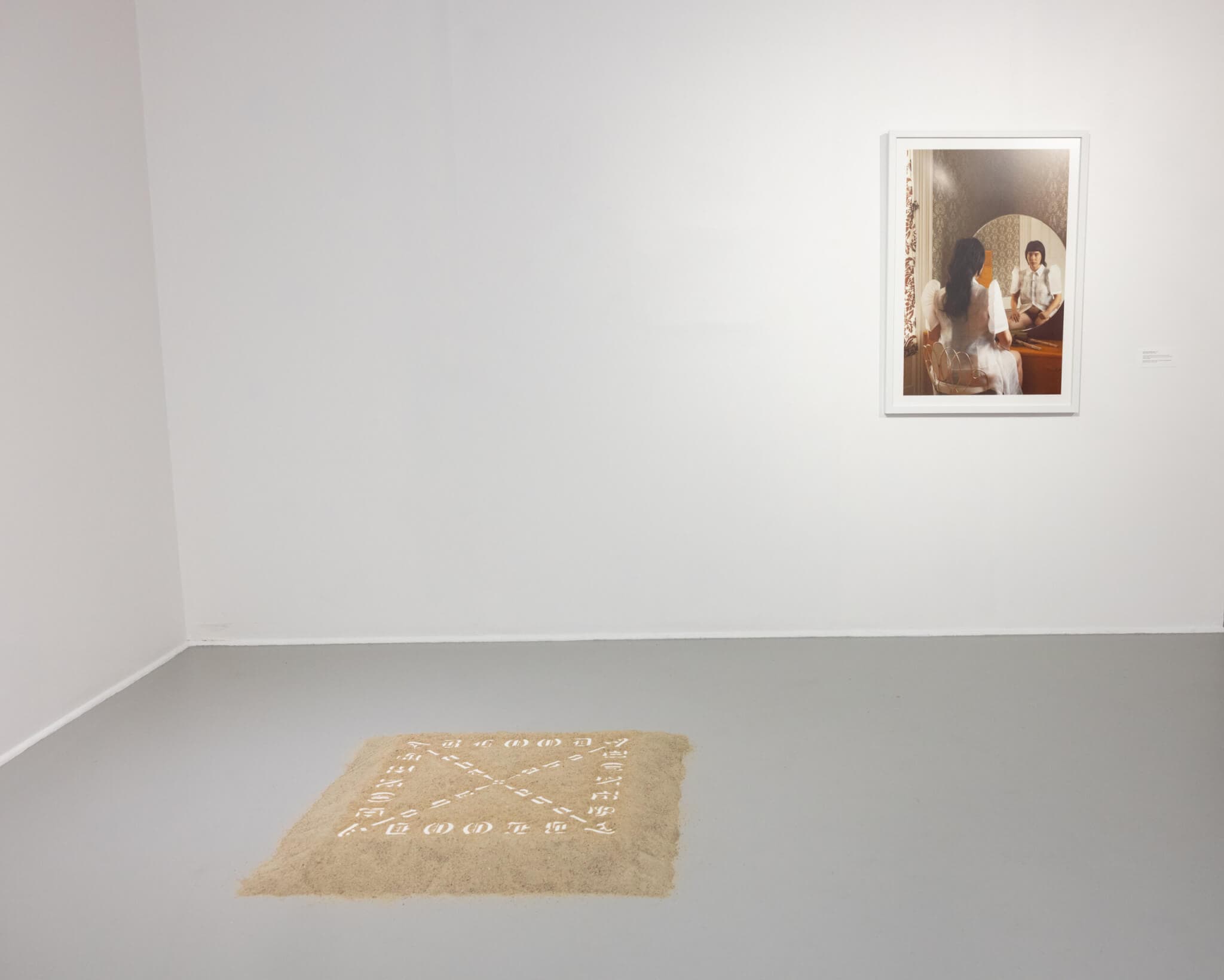 The hard part about Lani Ascunción’s BLOOD, BONES, ALOHA! (2024) featured in “Duty-Free Paradise” —their retrospective exhibition at the Mills Gallery at the Boston Center for the Arts—is trying not to trip over it. Moreover, tracing your feet along its outline as you attempt to discern the writing emblazoned across the surface. The piece is a small mesa of sand that gently slopes at the edges, creating the effect of a ruin or something aged beyond recognition. It requires you to adjust yourself in a manner that ironically turns viewer into spectacle, despite or because of the work’s simplicity. The message inscribed is similarly constructed to ensnare the viewer’s biases. Distilled from the memoir of Hawaii’s last monarch, Queen Lili‘uokalani, the phrase “Blood, bones, aloha!” ostensibly evokes the violence of colonialism. But as the broader quote suggests—“My love for my homeland and my beloved people, the bones of my bones, the blood of my blood! Aloha!”—the words are equally a radical declaration of a love so potent it seeps into the viscera of a people, and as the work conveys, is sown within the land itself.