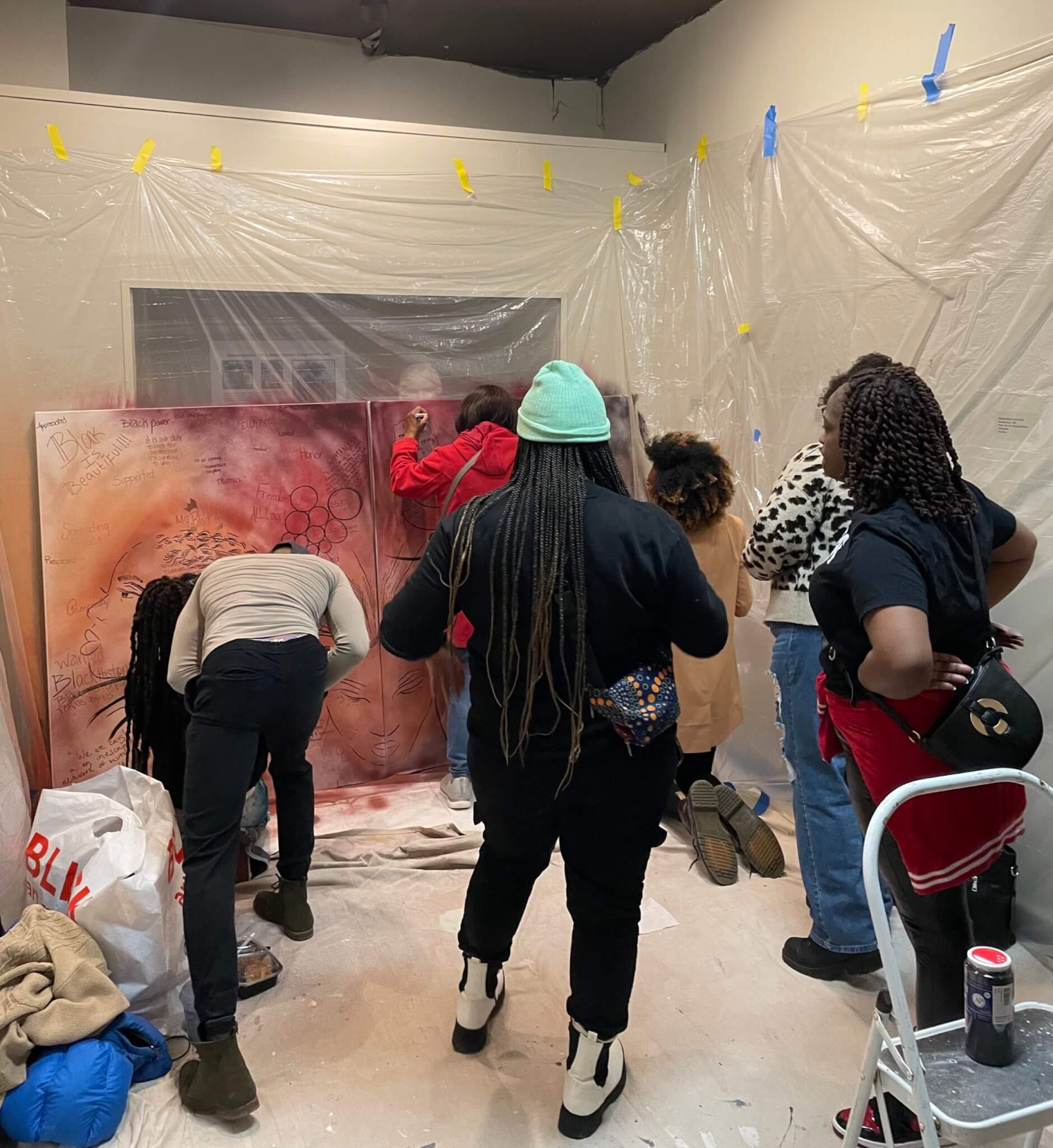 Attendees writing additional intentions for the Black Diaspora on the I AM canvas next to artist Sagie Vangelina (bottom left). Photo by Niara Hightower.