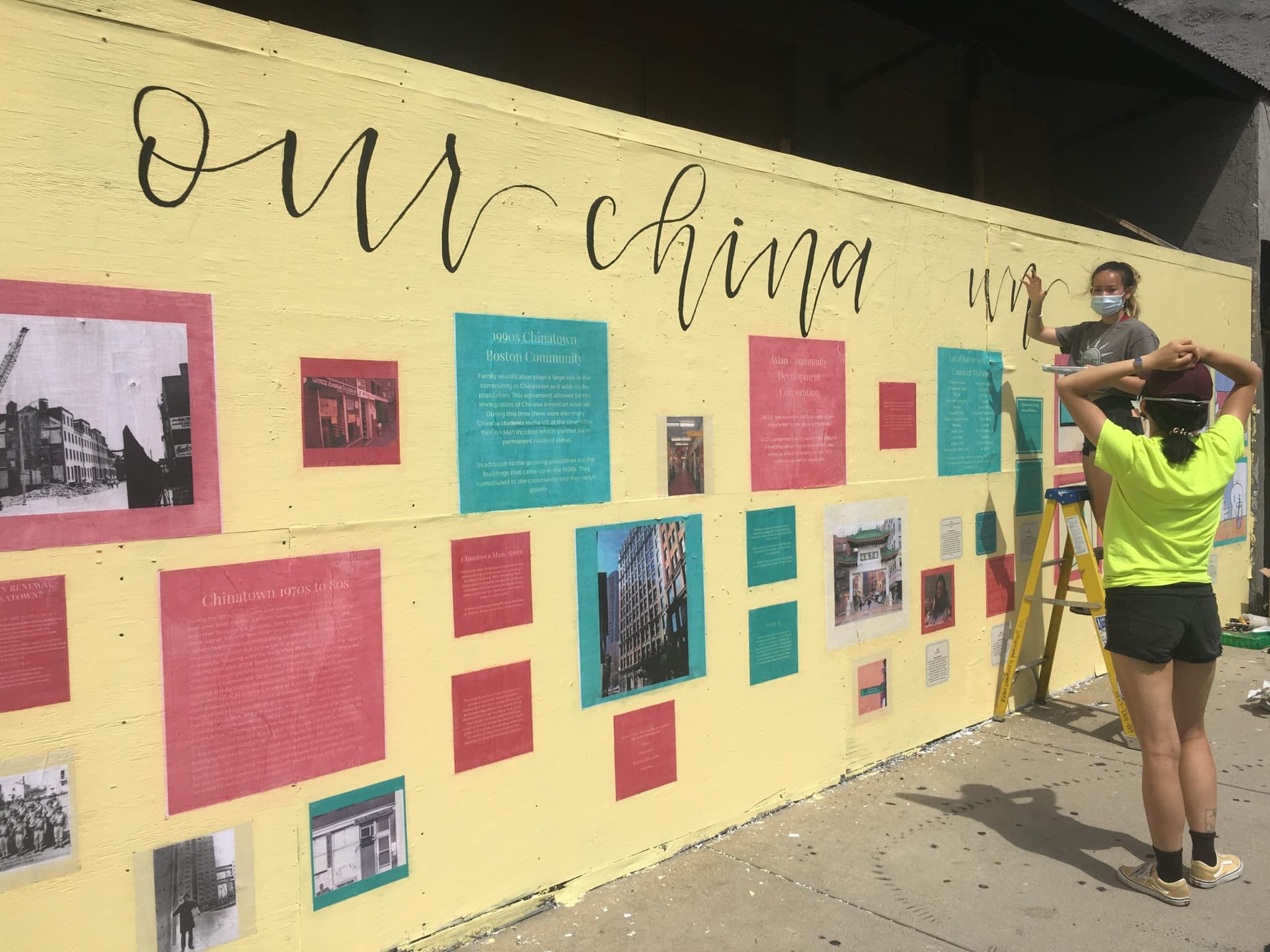 Artists Lily Xie and Crystal Bi Wegner installing Our Chinatown, wheatpaste mural at 150 Kneeland Street. Photo courtesy of Space Us.