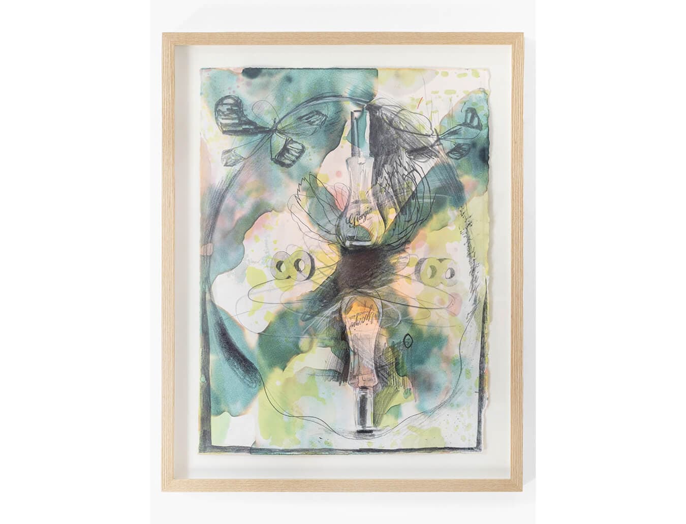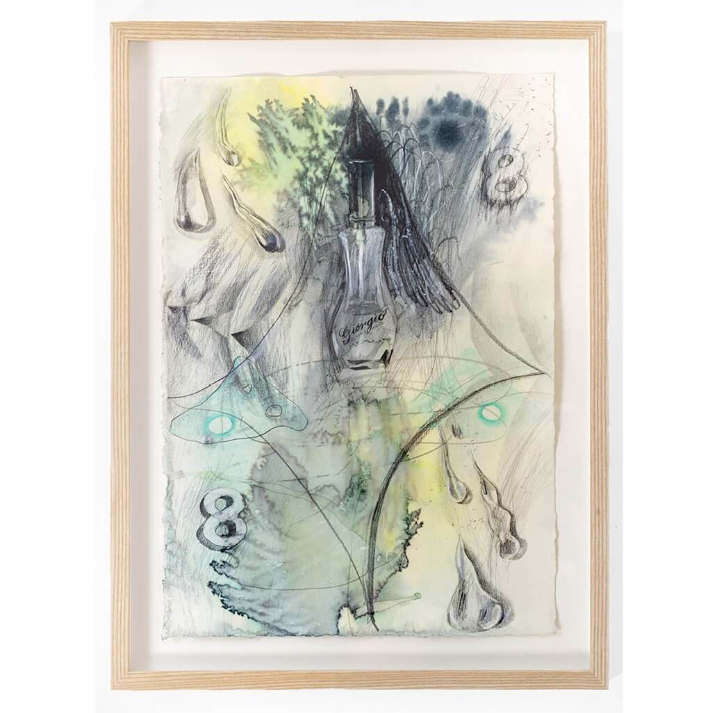 The works on view cover the last four years of McPherson’s practice. Rather than being arranged by date or medium, they are uniformly hung at eye level, acting as small portals. McPherson revisits symbols and motifs in multiple media, creating a dialogue that synchronizes the various techniques she uses to achieve the desired effect. The show’s namesake bottle appears in the more recent drawings on paper from this year. In Cathexis Butterfly (2024), for example, McPherson diligently reproduces the perfume bottle’s sumptuous form in graphite, layering it with abstract fields of chartreuse and teal watercolor. Scribbled butterflies surround the bottles of Giorgio, their jagged forms in stark contrast to the smooth lines of the bottles. The frenetic energy of the linework mingles with the mottled, nebulous watercolors, meeting in the dark space between the two bottles that pulls everything in like a black hole.