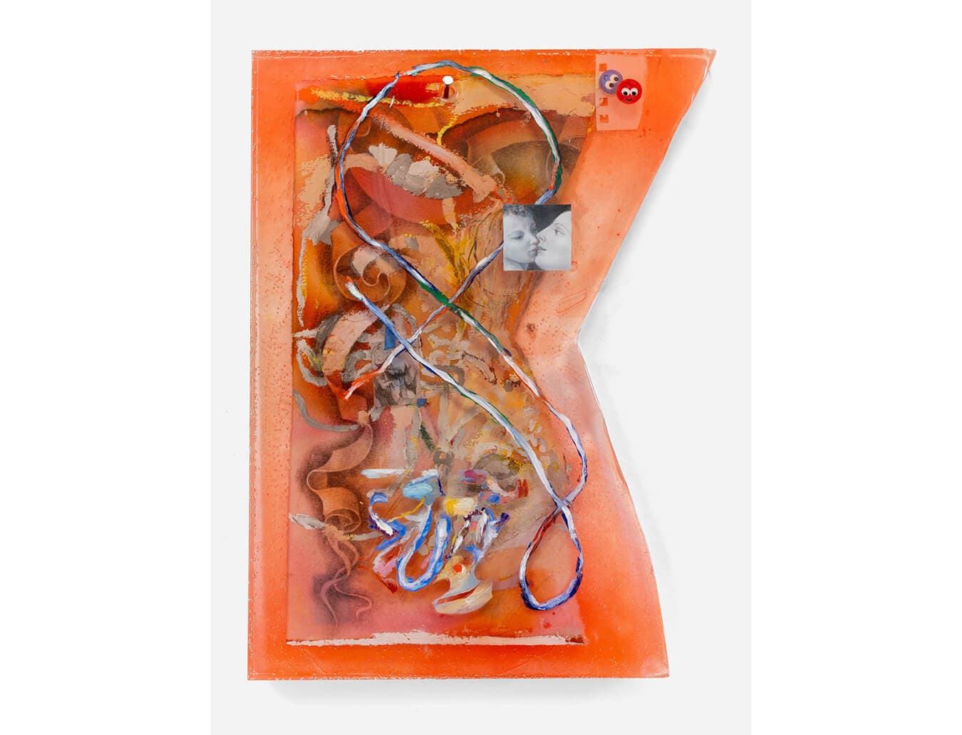 Faces—particularly of religious figures—appear throughout the works like visions from a fever dream. There are references sampled from traditional European painting (perhaps Golden Age Dutch or Italian Renaissance?) as well as saintly faces. McPherson refers to these as “distorted emblems of sacrality,” poetically noting she is not interested in their original meanings but rather the ideas they contain as symbols of devotion: “I am reaching towards someone else reaching towards god,” she writes in her text. Like a sample of one song in another, they are meant to evoke a feeling or a quick impression rather than reference a particular art history. Beneath the ribbon-like lines of paint in Cupid (2023–2024), McPherson has suspended a miniscule drawing of an expressive figure bent over folded hands. It’s a small detail, but a treat to discover among the layers of paint and paper. Elsewhere in the orange-hued, K-shaped epoxy painting is another scrap of frayed sketchbook, on top of which float two cartoon smiley faces that may or may not be stickers. These smiley faces appear throughout the exhibition, walking the line between playful and mocking depending on the context. Notably sited on top of the epoxy is a black-and-white image of a woman and child—or a cupid, as the title suggests—though the image is so tightly cropped, it is difficult to discern their exact relationship.