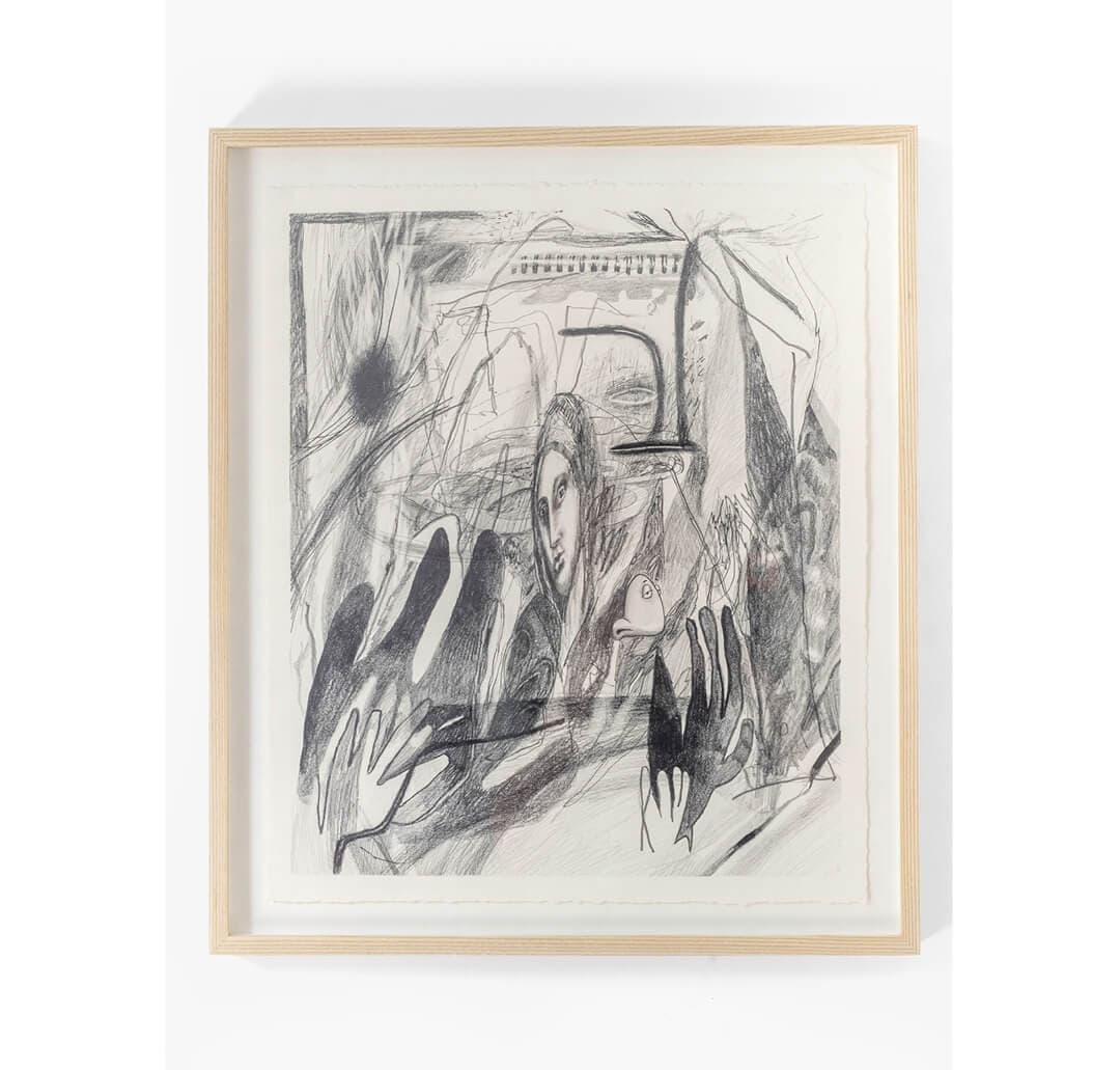 This energy, which gives the impression that the artist awoke after a particularly jarring dream and transcribed the feeling to paper, is repeated in other drawings, like 8 Giorgio mozzarella (2024) and Giorgio (2024). Giorgio, in particular, begets a playful dream-like quality. Look closely to see the mysterious bottle of perfume flanked by two butterflies. As with Cathexis Butterfly, the bottle’s realistic rendering lends a sort of “eye of the storm” calm within a frame full of abstract lines. But stand back and squint a little, and a face emerges. Now, the bottle is a nose, the butterflies loosely stand in for eyes, and the U-shaped traces of their movement resemble a very round chin and cheeks.