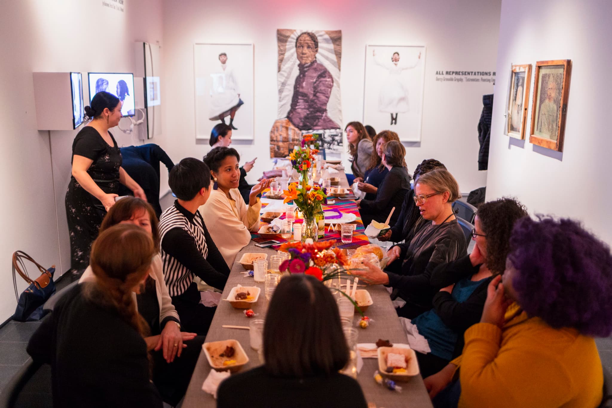 Many of Rydz’s water-related works have invited viewers to become participants, to collaborate as fellow researchers and creators. Floating Artifacts, a series featuring magnified portraits of minuscule pieces of plastic, allowed gallery-goers at Tufts’ Aidekman Arts Center to peer at specimens under a microscope and use typewriters to record their own observations on index cards. Her project Salty > Sour Seas had ICA visitors investigating ocean acidification by pH testing and painting with water samples from Boston Harbor—and by taste testing sour popsicles made with lime juice, Atlantic sea salt, and phytoplankton (the vital and vulnerable algae that form the base of aquatic food chains and produce half the atmosphere’s oxygen). “I wanted people to consume something unexpected,” Rydz explains. “I think food can be such a connection to memory and to remembering an experience.” The link between food and memory is at the heart of Comida Casera, an intimate event series that’s pushed the participatory ethos of Rydz’s practice even further. The name of the project translates to “homemade food,” and participants are asked to bring a dish inspired by a woman who gives them a sense of home. Rydz curates the guest list, gathering women from a wide range of backgrounds and ages for a social experiment that catalyzes moments of connection. “You’re sitting with strangers, which can seem a little strange, maybe uncomfortable at first,” she says. “But then the night begins.” At this anything-but-average dinner party, the first course might well be dessert. Rydz usually starts the meal by sharing the story behind her own dish—say, a bread pudding inspired by her mother, made with challah and layers of guava. “My mom makes this challah bread pudding that feels like a connection to her parents, and the guava is a connection to my parents, who have a guava tree in their backyard,” Rydz explains. “I talk a little bit about her and her generosity and the warmth of this bread, the smell . . . it’s a real comfort dish that reminds me of home. It also reminds me of her resourcefulness: nothing goes to waste in her house.”