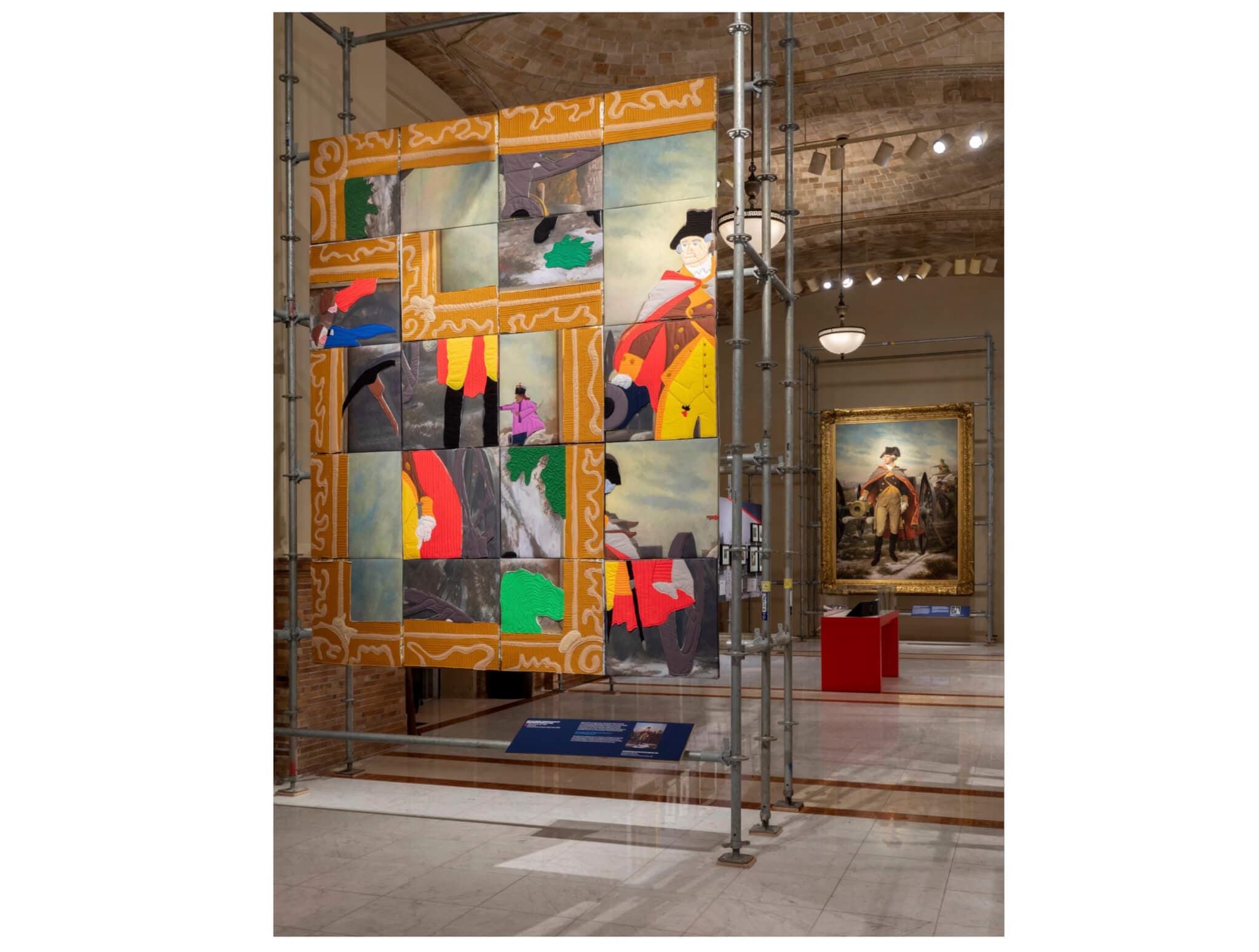 Michael Thorpe’s Out of Order, Fortification of Dorchester Heights (2025), commissioned for this exhibition, delivers its perfectly fitting final note. Thorpe’s quilt deconstructs and reassembles Emanuel Leutze’s 1852 oil painting Washington at Dorchester Heights, seen early in the show and normally hung behind the library’s reference desk. This massive painting depicts a turning point in the Revolutionary War, when General Washington’s amassing of cannons prompted British troops to evacuate Boston after a year-long siege. Purchased in 1955 with funds raised by Boston Public School students, it shows the founding father who enslaved more than three hundred people in a traditional heroic pose, his white-gloved hand resting on one of those cannons. It took a crew six hours to transport this ten-foot-tall behemoth across the library. Thorpe’s quilt, positioned so you can view both works simultaneously, offers quite a counterpoint. Drawing on traditions of expressive quilting developed by African American women like the quilters of Gee’s Bend, Alabama, it’s soft, lightweight, alive with bright color and squiggling stitches. And, crucially, it’s modular. Thorpe, who grew up in Newton and moved to New York in 2020, has returned to the library multiple times over the course of the show to rearrange the square panels. It’s a work always in progress, and it feels completely congruent with the exhibition’s design and themes.