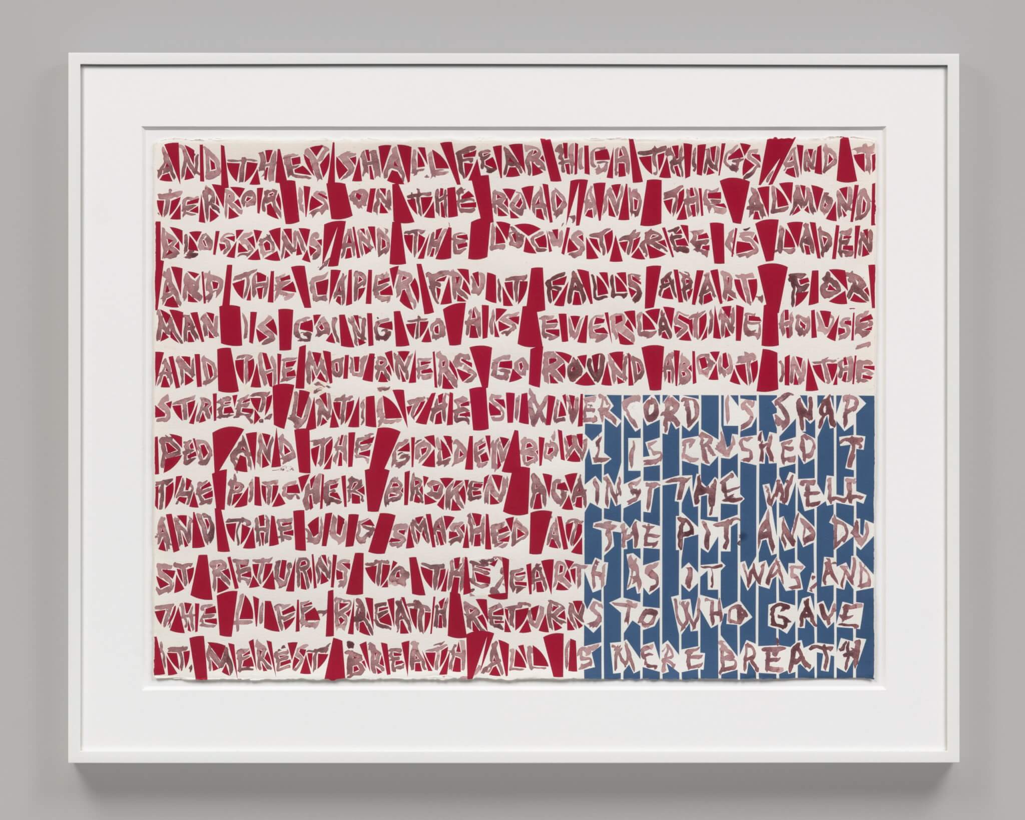 The exhibition’s final section, Another World Is Possible, features work by living artists, many of whom rework forms and materials of the past to engage with urgent concerns of the present. I’ll zero in on three of them here, starting with two Boston-based artists. Taylor Davis’s gouache and watercolor work And They Shall Fear (2024) presents the American flag upside down, as it was historically flown by ships in distress. She forms her stars and stripes from the words of Ecclesiastes 12, using ancient text to speak to contemporary experiences of families separated at the US-Mexico border. Without the wall text, I wouldn’t have known to make that connection, but it certainly feels like “terror is on the road” for many at the moment. Davis painstakingly painted these words with a three-foot-long dowel; reading them likewise demands slow and careful attention. Another wall showcases Caleb Cole’s poignant, poetic In Lieu of Flowers, an ongoing series memorializing trans people murdered in the US through anthotypes, a nineteenth-century form of photography made with photosensitive material from plants. Here we see four portraits, all made in 2024, of subjects killed in Massachusetts, among them Rita Hester, whose unsolved 1998 murder catalyzed the Transgender Day of Remembrance, and Jahaira DeAlto Balenciaga, an activist and aspiring social worker who helped found that day before she too was murdered in 2021. Cole creates these tender works with sunlight, roses from their garden, and the subjects’ own self-portraits. Time is another ingredient: The exposures require days or weeks of devotion, and like any bouquet, the delicate results fade over time.