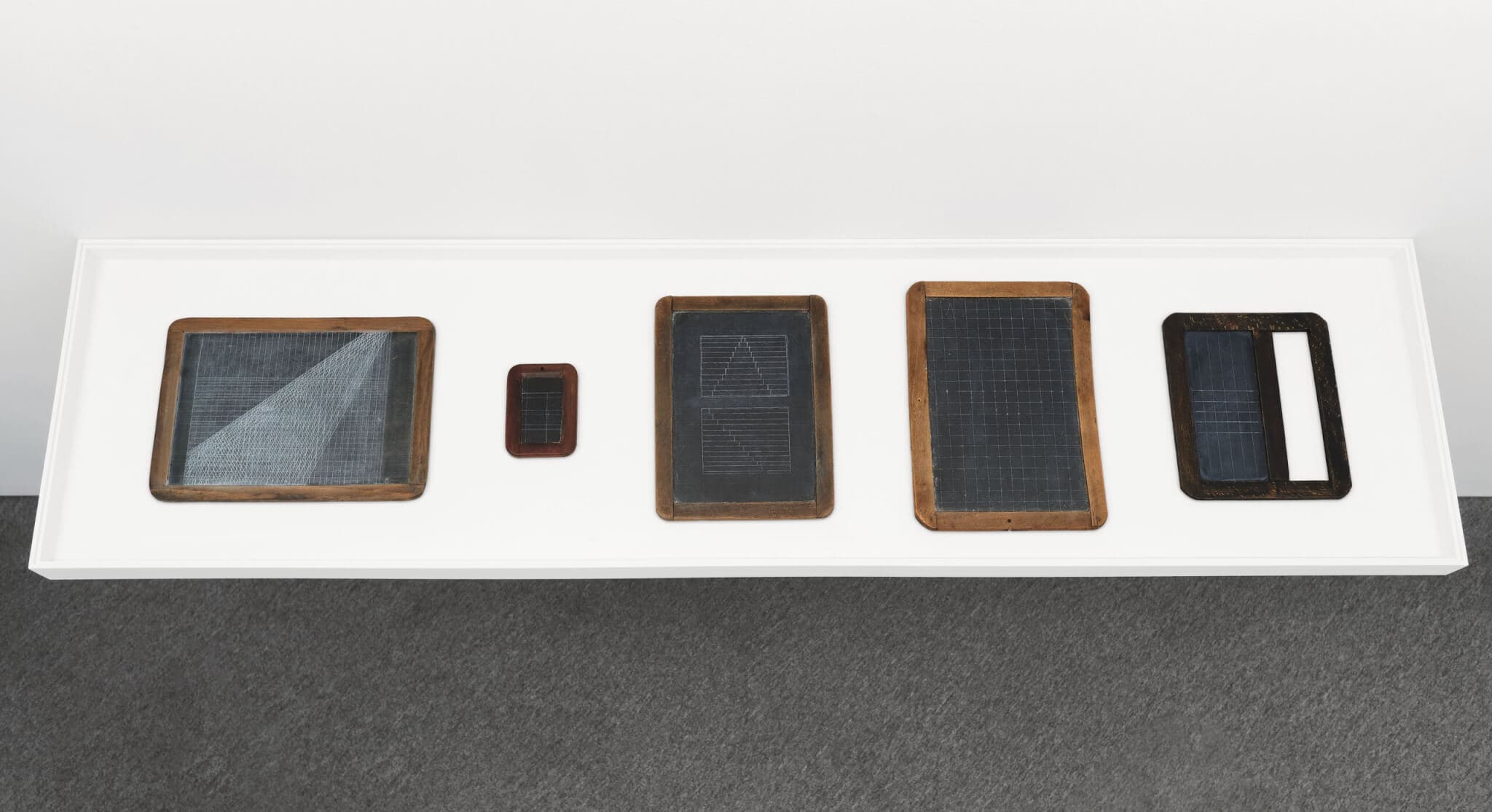 Victoria Burge, installation view of various untitled works, all 2024. Chalk, engraving, and oil paint on 19th Century schoolhouse slate. Various dimensions. © Victoria Burge. Photos courtesy of the artist and Krakow Witkin Gallery.