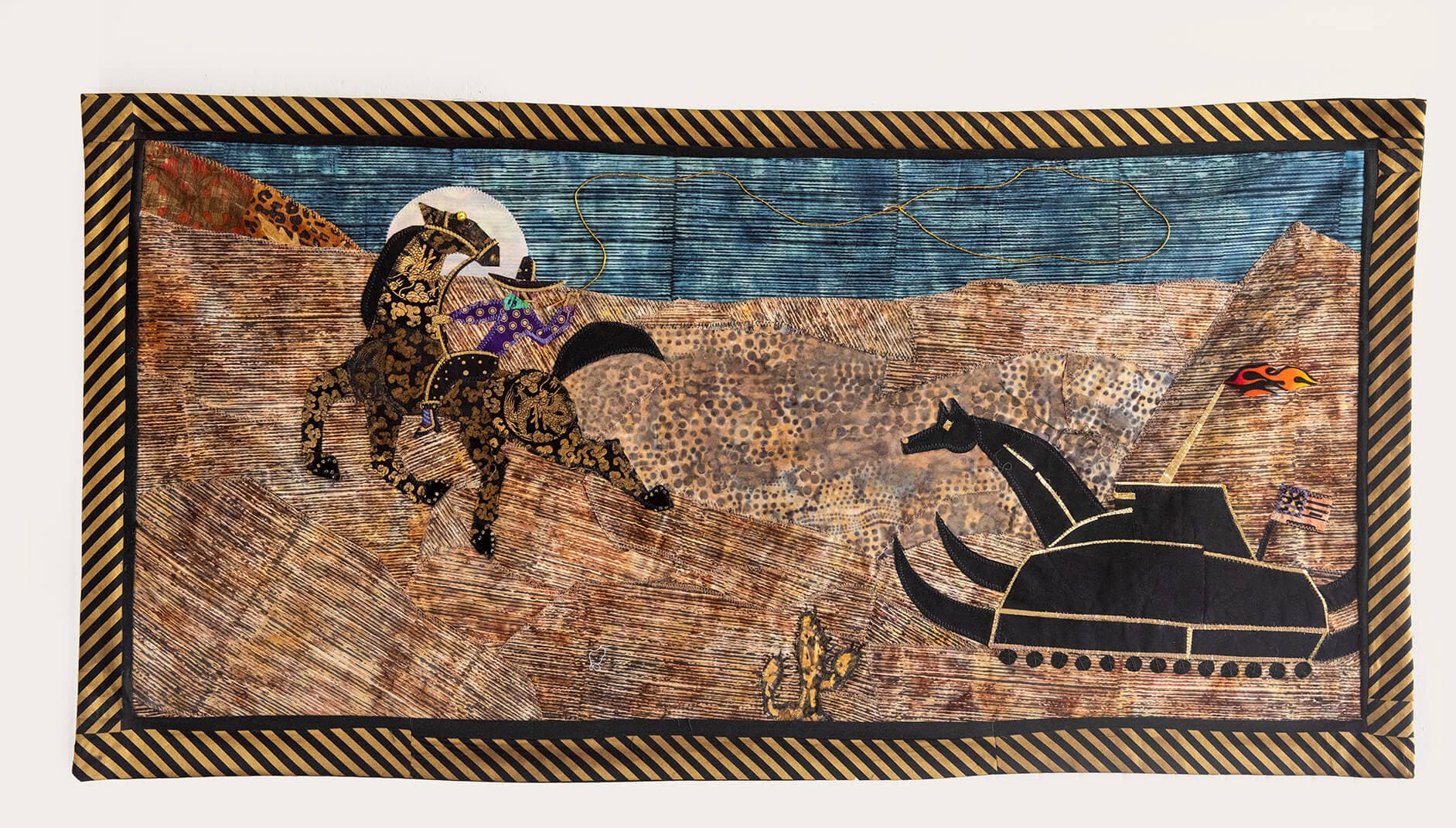 Threading humor throughout her quilts, Clara Wainwright interrogates structures of power that define our social and political landscapes. Works in “GLORY” imaginatively take up President Donald Trump’s rise to office: the persistence of his supporters, elephantine gifts from other world leaders, and his encounters with popular culture in a peculiar pursuit of a character that transforms from Beyoncé Knowles-Carter to Vice President Kamala Harris. Wainwright found her voice using her hands to make quilts in the 1970s and has since been dedicated to guiding members of her communities in Boston to do the same by teaching youth art classes and leading group quilting projects. She focuses not on precision of line but of expression; characteristically, her vibrant quilts like Cowboy Carter (2024) and The Failed Lasso of the Trojan Rocker (2024) provoke laughter and inquisition. Wainwright embraces space wherein the serious and the ridiculous coexist.