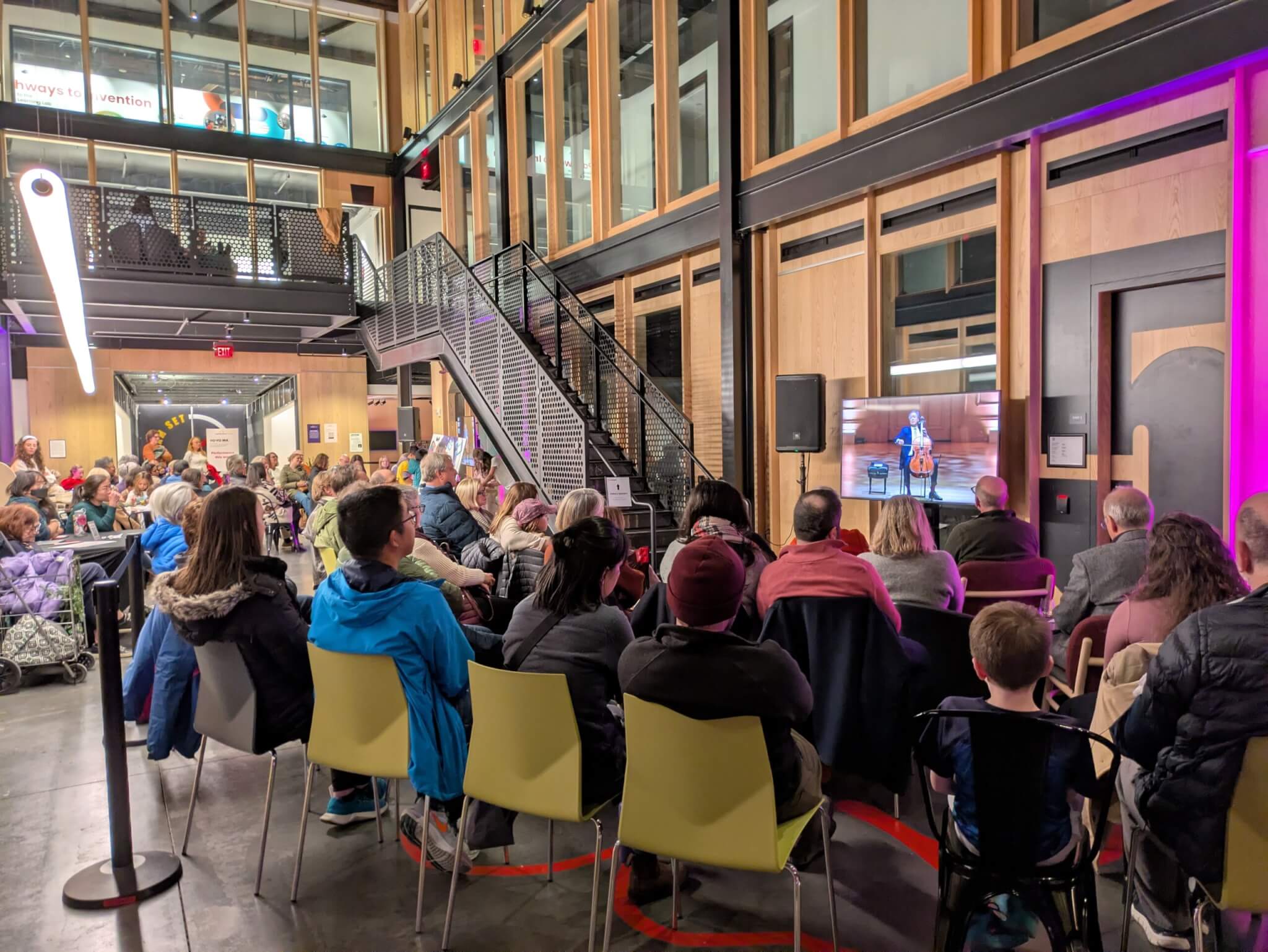 At the Foundry, in Cambridge, attendees gathered to watch Yo-Yo Ma’s performance via simulcast, November 21, 2025. Photo courtesy of Jenn Chang.